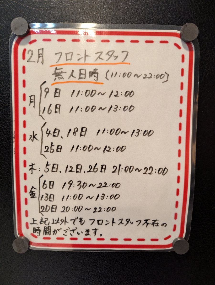 無人営業日:第2、第4日曜日(連休を挟む場合は最終日が無人営業日)