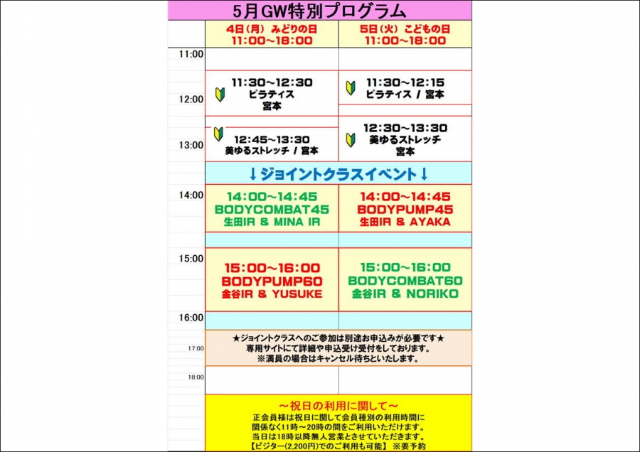 5月はGWやジョイントクラスなどいろいろございますが、